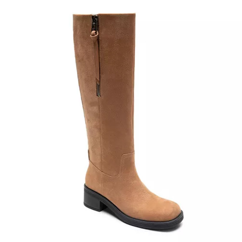 The Morrison Boots by Aerosoles have a classic pull-on design with a knee-high silhouette that’s versatile and flattering. They have the look of an elevated leather moto boot, but in a Camel Pebbled Nubuck color rather than standard black. The toes of the boot have a square design with rounded edges, which are less restricting than pointed-toe styles.